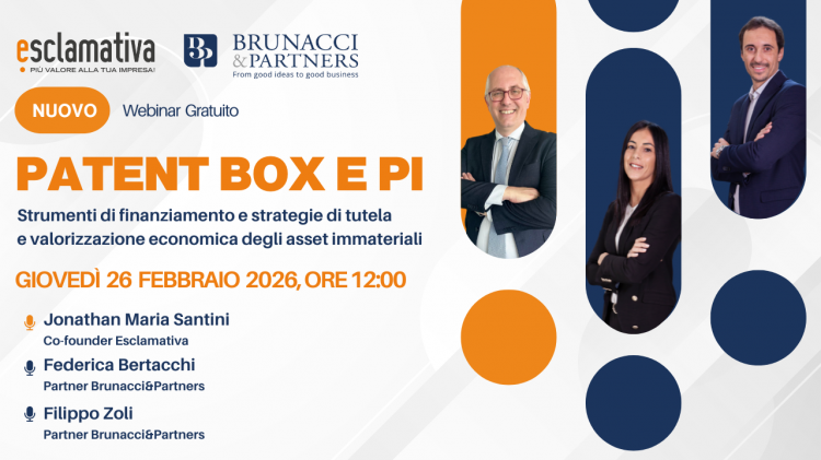 In questo webinar gratuito, Esclamativa e Brunacci & Partners mettono a sistema competenze complementari per accompagnare le imprese lungo un percorso consapevole: dalla corretta protezione degli asset immateriali fino alla loro valorizzazione economica, anche attraverso il Patent Box.