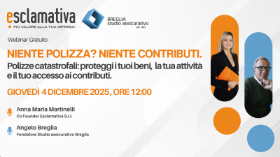 Il 4 dicembre 2025 alle ore 12:00 Esclamativa, in collaborazione con Studio Assicurativo Breglia, organizza un webinar gratuito dedicato all’obbligo della polizza catastrofale per le imprese. Dal 2025 questa copertura diventa infatti un requisito per accedere a molte forme di finanza agevolata. Durante l’incontro verranno illustrate le nuove scadenze, i beni da assicurare, i rischi per chi non è in regola e come verificare la conformità della propria polizza. Un appuntamento utile per imprenditori e responsabili amministrativi che vogliono proteggere l’azienda e non perdere contributi.
