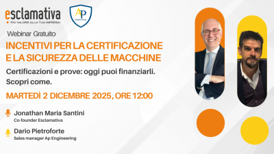 Scopri quali certificazioni, prove tecniche e consulenze possono essere finanziate e come prepararti al nuovo Regolamento Macchine UE 2023/1230, in vigore dal 2027. Evento a cura di Esclamativa e Ap Engineering.